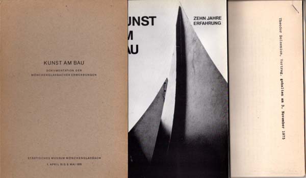 Kunst am Bau. 10 Jahre Erfahrung. Dokumentation der Mönchengladbacher Erwerbungen. Städtisches Museum Mönchengladbach, 1. April bis 9. Mai 1976. 1. Auflage. Mönchengladbach. Städtisches Museum. 1975. 23 x 16 cm. 62 S., 1 Blatt; 2 Blatt / 5 Blatt / 20 Blatt – jeweils geklammert. OKlapp-Karton und geheftete Blätter in OPapp-Chemise. Schuber am Deckel etwas gebräunt, sonst sehr gutes Exemplar. Dokumentiert die Erwerbungen des Museums für den Außenraum, u. a. Plastiken von Fontana, Kricke, LeWitt, Mack, Piene, Rückriem, Tinguely, Uecker etc. Als geklammerte, xerographierte Lose-Blatt-Sammlung dabei die Einführung von Johannes Cladders, wiedergegebene Zeitungsartikel zu Ankäufen sowie ein Vortrag von Theodor Bolzenius.