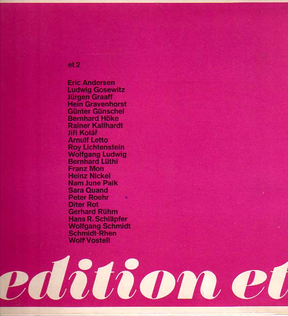 edition et 2. Herausgegeben von Bernhard Höke. 1. Auflage. Berlin. edition et im Verlag Christian Grützmacher. 1966. 23 x 23 cm. 47 unpaginierte Tafeln, teils mehrfach klapp- oder faltbar. OKarton – Mappe. Sehr gutes, frisches Exemplar. Die zweite Mappe der edition et enthält Grafiken von 23 Künstlern, u.a. Eric Andersen, Ludwig Gosewitz, Bernhard Höke, Jiri Kolar, Roy Lichtenstein, Bernhard Lüthi, Franz Mon, Nam June Paik, Peter Roehr, Gerhard Rühm, Wolf Vostell etc. Vollständiges Exemplar, 50 in 36 Tafeln.