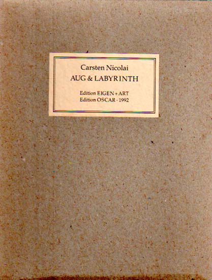 Nicolai, Carsten: Aug & Labyrinth. Auflage: 1000 Exemplare. 2 Bände. Leipzig / Chemnitz. Edition Eigen + Art / Edition Oscar. 1992. 22 x 17 cm. 28 unpaginierte S., 24 S., Klapptafeln. OKarton mit OKlappenumschlag in OKarton-Schuber. Schuber an der oberen Kante leicht aufgeplatzt, sonst gutes Exemplar. Durchgehend mit SW-Abbildungen versehen.