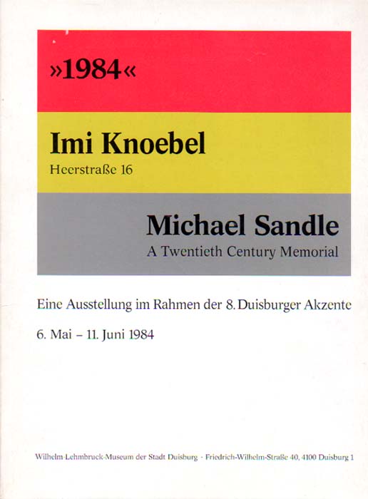 Knoebel, Imi / Michael Sandle: 1984. Heerstraße 16 (Imi Knoebel) / A Twentieth Century Memorial (Michael Sandle). Eine Ausstellung im Rahmen der 8. Duisburger Akzente 6. Mai – 11. Jini 1984. 1. Auflage. 2 Bände. Duisburg. Wilhelm-Lehmbruck Museum der Stadt Duisburg. 1984. 27 x 21 cm. Verleimter Buchblock, 6 Blatt; 31 S., 1 Blatt. OKarton in OPapp-Schuber. Der Schuber an der oberen Falz etwas angeplatzt, sonst aber sehr gutes Exemplar. Erschienen als Künstlerbuch respektive Objektbuch anlässlich der Doppelausstellung im Rahmen der Duisburger Akzente. Das Katalogbuch Knoebels besteht aus einem zusammengeleimten Buchblock von etwa 60 Seiten sowie einem anhängenden Text von Karl-Egon Vester.