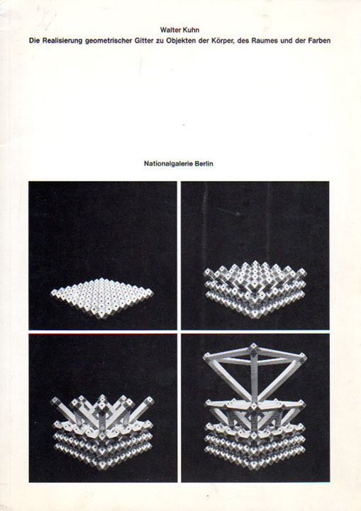 Kuhn, Walter: Die Realisierung geometrischer Gitter zu Objekten der Körper, des Raumes und der Farben. 7. März bis 20. April 1980. Erste Auflage. Berlin. Nationalgalerie. 1980. 30 x 21 cm. 67 S. OKarton. Kapital leicht bestoßen, Einband leicht angestaubt, sonst gutes Exemplar. Mit einem Vorwort von Dieter Honisch sowi einer Biografie und einem Text zur Ausstellung von Walter Kuhn. Durchgehend mit oft farbigen Abbildungen versehen. Beiliegend: 4 seitige Ergänzung zur Ausstellung mit Lageplan der Objekte.