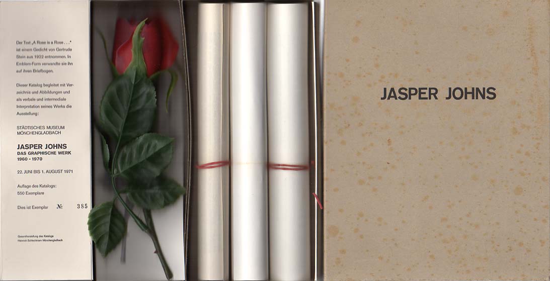 Johns, Jasper: Das Graphische Werk 1960-1970. (Rose is a Rose is a Rose is a Rose). Städtisches Museum Mönchengladbach, 22. Juni bis 1. August 1971. Mönchengladbach. Städtisches Museum. 1971. 21 x 17 cm. OPapp-Kassette. Eine Deckellasche und teilweise der Dekcleboden gering stockig, sonst sehr gutes Exemplar. Nummer 112 von 550 nummerierten Exemplaren. Enthalten sind in der in 2 Kammern unterteilten Papp-Kassette eine rote Plastikrose und eine s/w Fotowiedergabe der Rose sowie 3 Schriftrollen mit Abbildungen von Jasper Johns Variationen über die Glühbirne, einem Verzeichnis der Druckgrafik und einem Text von Carlo Huber und Johannes Cladders. Beiliegend die Einladungskarte zur Ausstellung. [Vgl. Rennert / Titz. Die Kassettenkataloge des Städtischen Museums Mönchengladbach 1967 – 1978, Köln 2021, Nummer 14, S.164 – 171; Glasmeier: Die Bücher der Künstler; 443, S. 181].