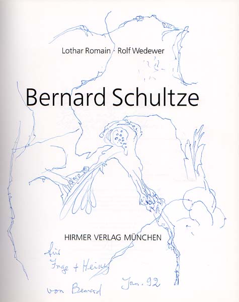 Schultze, Bernard – Lothar Romain [und] Rolf Wedewer: Bernard Schultze. Erste Ausgabe. München. Hirmer Verlag. 1991. 33 x 28 cm. 126 S., 315 Tafeln. OLeinen mit OUmschlag in OPapp-Schuber. Sehr gutes, frisches Exemplar. Umfangreichste Werkmonographie des informellen Künstlers. Mit 315 meist farbigen, ganzseitigen Abbildungen sowie fotografischen Dokumenten. Mit einer über das gesamte Titelblatt gehenden Migof-Zeichnung Schulzes in blauem Kugelschreiber, zugeeignet und signiert „von Bernard“, Januar 1992.