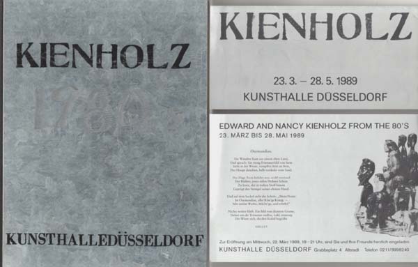 Kienholz, Edward and Nancy: 1980´s. Kunsthalle Düsseldorf, 23.3. bis 28.5.1989. Museum Moderne Kunst, Museum des 20. Jahrhunderts, Wien, 29.9. bis 12.11.1989. 1. Auflage. Düsseldorf. Städtische Kunsthalle Düsseldorf. 1989. 27 x 21 cm. 157 S., 1 Blatt. Stahlblechdecken mit Leinenstreifenrücken. Sehr gutes Exemplar. Mit Texten von Jürgen Harten und Hans-Werner Schmidt in Deutsch und Englisch sowie einem breiten Werkquerschnitt mit ausführlichen Erläuterungen. Vorzugsausgabe des Katalogbuches mit einem Einband aus Stahlblechen mit Titel in Siebdruck und Kratzung „1980s“. Nummer 116 / 200 vorne unten rechts geritzten Exemplaren. Mit beiliegender Einladungskarte und Leporellofolder zur Ausstellung, beide ebenfalls in Silber gehalten.