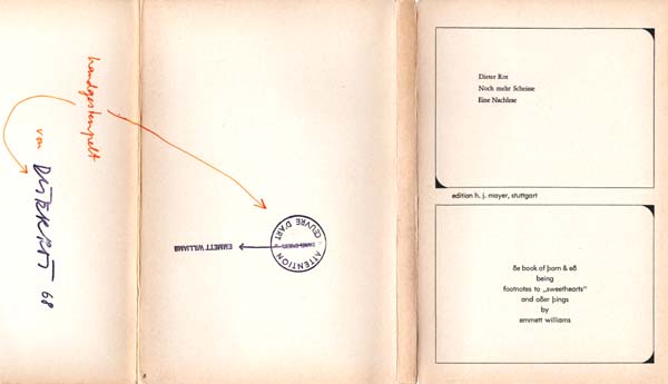 Rot, Diter: Noch mehr Scheisse. Eine Nachlese. Footnotes to Sweethearts by Emmett Williams. Auflage 500 Exemplare. Stuttgart. Edition Hansjörg Mayer. 1968. 22,5 x 14,5 cm. 99 S., 2 Blatt. OKarton mit OUmschlag. Obere Umschlagkante gering berieben, Rücken minimal nachgedunkelt. Insgsesamt sehr gutes Exemplar. Erste Ausgabe, Nummer 263 von 500 Exemplaren, mit Gummistempelsignaturen von Diter Rot auf der hinteren Innenklappe sowie auf der Umschlagrückseite von Emmett Williams, hier mit weiterem Stempel „Attention – Oeuvre d´Art“. Beide Stempel sind verbunden mit einer handschriftlichen Anmerkung in der Handschrift Diter Rots oberhalb von dessen Namensstempel – „handgestempelt von“ – und mit einem Bogen zu Emmett Williams Stempel versehen. Es erschien 1983 ein Reprint im Rainer Verlag. In der ersten Ausgabe selten. [Vgl. Dobke. Bücher + Editionen, S. 173].