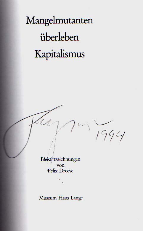 Droese, Felix: Mangelmutanten überleben Kapitalismus. Bleistiftzeichnungen von Felix Droese. Museum Haus Lange, 29.1. bis 25.3.1984. Auflage: 700 Exemplare. Krefeld. Museum Haus Lange. 1984. 30 x 21 cm. 119 S. OPappband. Einband etwas angestaubt, sonst gutes Exemplar. Titel mit großflächiger handschriftlicher Signatur von Felix Droese in Bleistift, datiert 1994. Nummer 514 von 700 handschriftlich nummerierten Exemplaren. Durchgehend mit Wiedergaben von Zeichnungen versehen. Erschien anläßlich der gleichnamigen Ausstellung im Museum Haus Lange, Krefeld, 29.1. bis 25.3.1984.