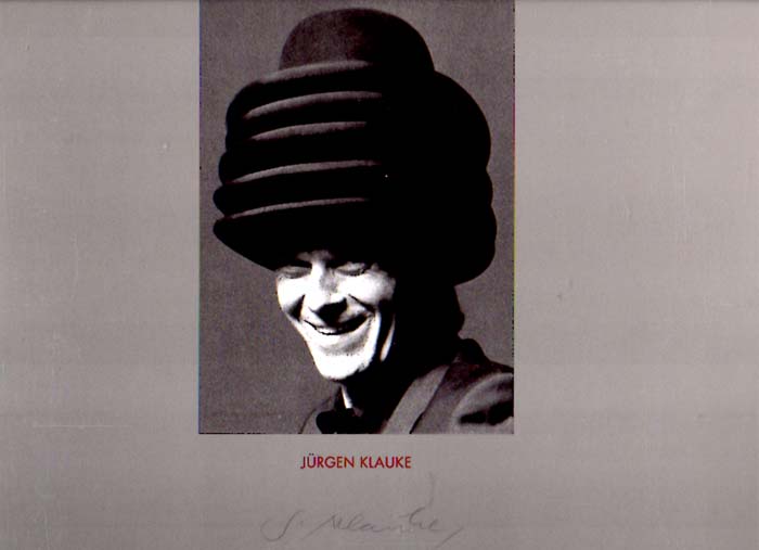 Klauke, Jürgen – Theo Rommerskirchen [Herausgeber]: Idiotische Seinsbefragung. Signatur Zeit Schrift Bild Objekt. Erste Auflage. Remagen. Verlag Rommerskirchen Rolandshof. 1999. 30 x 29 cm. 28 unpaginierte S. OKarton im Plexiglas-Schuber. Gutes bis sehr gutes Exemplar. Signatur 31. Durchgehend mit ganzseitigen Abbildungen versehen. Nr. 79 von 990 nummerierten Enplaren mit eigenhändiger Signatur von Jürgen Klauke auf dem Vorderdeckel. In Passepartout eingelegt ein Original-Kupferdruck des Künstlers.