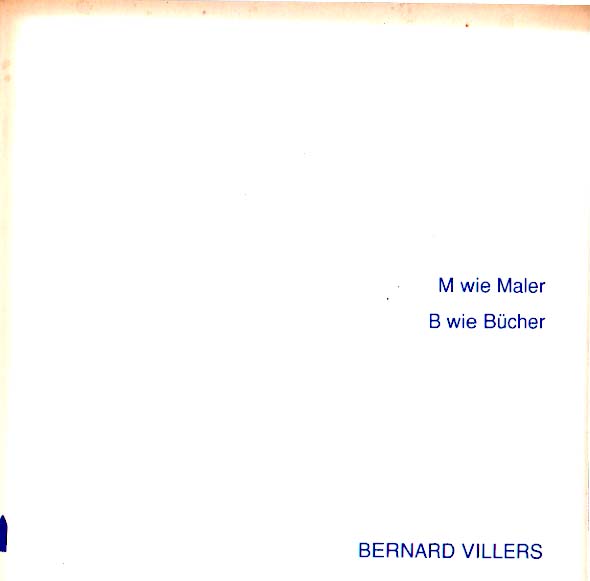 Villers, Bernard: M wie Maler. B wie Bücher. Neues Museum Weserburg Bremen 3. Juni – 12. September 1992. Erste Auflage. Bremen. Neues Museum Weserburg Bremen. 1992. 21 x 21 cm. 24 unpaginierte S. OBroschur. Ränder etwas lichtrandig, insgesamt papierbedingt leicht gebräunt. Gutes Exemplar. Sammlung der Künstlerbücher Band 3. Ausstellungskatalog mit einem Text von Guy Schraenen.