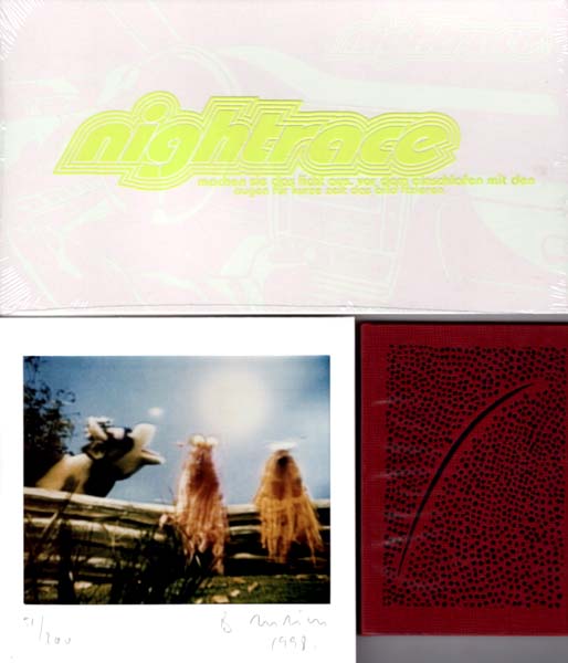 Frankfurter Kunstverein [Herausgeber]: Acht mal Acht mal Acht. Bourgeois, Decker, Grcic, Pridgar & Jurt, Martin, Pitsou, Schäfer, Schmidt. Vorgeschlagen von Adamopoulos, Bernoully, Kölle, Luy, Nitsch, Schroeter-Herrel, Weiermair, Ziemer. Auflage 400 Exemplare. Frankfurt. Frankfurter Kunstverein Steinernes Haus am Römerberg. 1998. 30,5 x 23,5 cm. Karton an den Ecken eingerissen, etwas angestaubt, Multiples sehr gut erhalten. Der Titel „Acht mal Acht mal Acht“ bezieht sich auf acht Installationen und Einzelausstellungen, organisiert von acht Kuratoren. Anlässlich der Ausstellung vom 18. 2. bis zum 22. 3. 1998 erschien eine Pappschachtel mit 8 Objekten. Die Box enthält eine Begleitbroschüre sowie Multiples von Vera Bourgeois (Videokassette)/ Tamara Grcic ( Katalog „Falten“)/ Bernhard Matin (″Sofortbild“, signiert)/ Pridgar und Jurt (″nightrace“, phosphorisierender Siebdruck, signiert)/ Edwin Schäfer (Buch „Streuperforation“)/ Evangelia Pitsou (Katalog, signiert)/ Simone Decker (Gartenlaube Accessoire, signiert) und Enno Schmidt (Wilhelmi Werke/ Postkarte, monogrammiert).