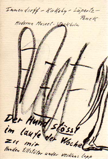 Immendorff, Jörg [und] Per Kirkeby, Markus Lüpertz, A. R. Penck: Hunden tillstöter under veckans lopp / Der Hund stösst im Laufe der Woche zu mir. Moderna Museet, Stockholm, 14 februari – 29 mars 1981. Erste Auflage. Stockholm. Moderna Museet. 1981. 20 x 13 cm. 131 S. OKarton mit illustriertem OKlappenumschlag. Einband etwas lichtspurig und nachgedunkelt. Innen papierbedingt wenig lichtrandig, sonst gutes Exemplar. Moderna Museets utställningskatalog nr 170 / Ausstellungskatalog Nr 170 aus Moderna Museet. Durchgehend mit Abbildungen versehen, teilweise in Farbe. Texte in Schwedisch und Deutsch. Mit einem Vorwort von Olle Granath und einem Beitrag von Siegfried Gohr.