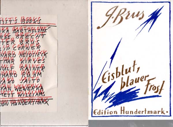 (Hundertmark, Armin): Artist´s Books. Monika Bartholomé – George Brecht – Günter Brus – Philip Corner – Bernard Heidsieck – Dietmar Kirves – Arnulf Rainer – Gerhard Rühm – Takako Saito – Stefan Wewerka – Emmett Williams. Erste Auflage. 10 Bände. Köln. Editon Hundertmark. 1984. 22 x 15 cm. Ca. 120 S. OKarton in OPapp-Schuber. Schube gebräunt, sonst gutes Exemplar. Vorzugsausgabe der Edition Hundertmark als Sammlung von 10 Heften (Brecht und Wewerka haben einen gemeinsamen Band). Nummer 32 / 80 nummerierten Exemplaren. Alle Beiträge – außer die Bände von Günter Brus und Arnulf Rainer – sind handschriftlich von den Künstlern signiert und nummeriert. Heft 11 – 20 der Reihe.