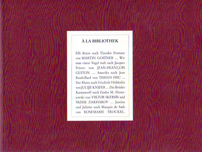 A la Bibliothek oder Bücher einer Ausstellung. Verwirklicht und mit einem Text versehen von Udo Kittelmann. Salzburger Kunstverein, 24. Oktober – 24. November 1990; Städtisches Museum Mülheim an der Ruhr, 16. März – 5. Mai 1991. Erste Auflage. Mülheim an der Ruhr. Städtisches Museum. 1991. 19 x 25 cm. 48 unpaginierte S. OKarton. Untere Einbandkante minimal berieben, Einband mit wenigen winzigen Fleckchen, sonst gutes Exemplar. Die Künstler: Martin Gostner, Jean-Francois Guiton, Tishan Hsu, Julije Knifer, Viktor Skersis, Vadim Zakharov und Rosemarie Trockel. Durchgehend mit Abbildungen versehen, teilweise in Farbe.