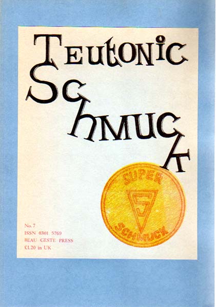Ehrenberg, Felipe and David Mayor [Editors]: Teutonic Schmuck. No. 7, December 1975. Edition of 400 copies. Cullompton – Devon / Tlacopac / Mexico. Beau Geste Press / Libro Accion Libre. 1975. 29 x 21 cm. 88 unpaginierte S. Okarton. Sehr gutes Exemplar. Die deutsche Ausgabe des englischen Fluxusperiodikums in der Covergestaltung John Plant. Enthält Beiträge unter anderem von Dorothy Iannone, Milan Kunz, C.O.Paeffgen, Dietrich Albrecht, Ludwig Gosewitz und vielen anderen. Durchgehend mit Abbildungen versehen. Auf dem hinteren Umschlagdeckel in Lasche eingelegt ein Künstlerbuch von Klaus Groh. Es erschienen insgesamt 8 Bände der Reihe.