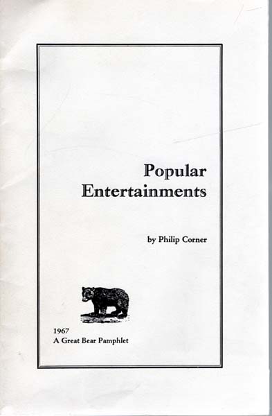 Corner, Philip: Popular Entertainments. Second edition. New York. Something Else Press. 1967. 22 x 14 cm. 14 unpaginierte S. OBroschur. Umschlag etwas angestaubt. Gutes bis sehr gutes Exemplar. A Great Bear Pamphlet. Durchgehend mit Abbildungen versehen.