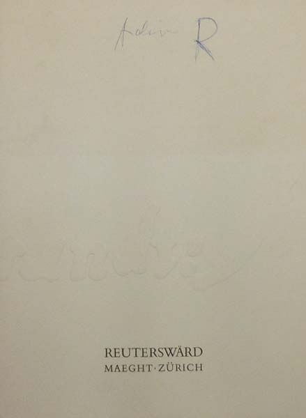 Reuterswärd, Carl Frederik: Reuterswärd. Erste Auflage. Zürich. Galerie Maeght Lelong. 1976. 32 x 23 cm. 3 lose Doppelbögen, 1 Blatt (= 14 S.). OKarton mit Prägedruck. Umschlag mit unschöner Notiz, Umschlag leicht gedunkelt und angestaubt. Ordentliches Exemplar. Mit einem Textbeitrag von Willy Rotzler. Enthält 12 teils farbig abgebildete Werke. Beiliegend: Einladung zur Eröffnung der Ausstellungen „Arnold Forel Pratt-Müller: Rapport d`exploitation de la societe d`investissement, L`art pur l`or / Carl Frederik Reutersward: Portraits“, 1979.