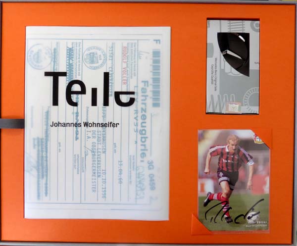 Wohnseifer, Johannes: Teile. Vorzugsausgabe. Köln. Verlag der Buchhandlung Walther König. 2013. 45,5 x 38,0 x 7,2 cm. 112 S. OKarton mit transparentem OUmschlag in OLeinen-Kassette, 2 Multiples. Sehr gutes Exemplar. Exemplar 2 / 7 der Vorzugsausgabe von „Teile“ als Multiple in einer audwändig gestalteten Kassette. Im Buch in Bleistift nummeriert und signiert, gleichfalls auf dem Boden der Box in Filzstift nummeriert, signiert und datiert 2013. Enthält neben dem Buch eine in transparenter Hülle eingelegte Autogrammkarte Rudo Völlers sowie einen Merzedesstern in Originalverpackung.