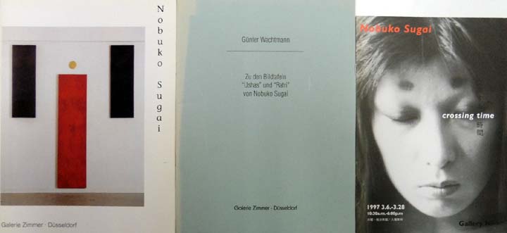 Sugai, Nobuko: Erscheinungen. Galerie Elke und Werner Zimmer, Düsseldorf, 22. März bis 7. Mai 1992. Erste Auflage. Düsseldorf. Galerie Elke und Werner Zimmer. 1992. 28 x 21 cm. 32 unpaginierte S. OKarton. Gutes Exemplar. Mit einem Textbeitrag von Susanne Wedewer. Durchgehend mit meist farbigen Abbildungen versehen. Beiliegend: Katalog „Nobuko Sugai: crossing time“, Gallery Nikko, Tokyo, 1997 3.6. – 3.28; Katalog „Günter Wachmann: Zu den Bildtafeln Ushas und Ratri von Nobuko Sugai“, Galerie Zimmer, Düsseldorf