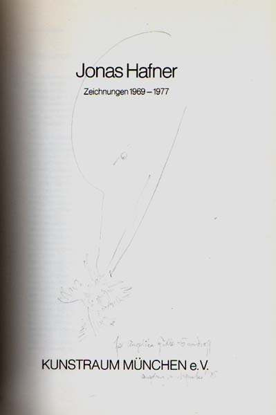 Hafner, Jonas: Zeichnungen 1969 – 1977. Kunstraum München e.V., 19.1. – 5.3.1978. Auflage: 600 Exemplare. München. Kunstraum e.V. 1978. 30 x 21 cm. 215 S., 1 Blatt. OKarton. Rücken gering aufgehellt, sonst sehr gutes Exemplar. Enthällt 101 ganzseitig wiedergegebene Zeichnungen. Auf dem Titelblatt eine Bleistiftzeichnung (Vogel mit Jungtieren), zugeeignet und datiert Augsburg, 2. September 1985.