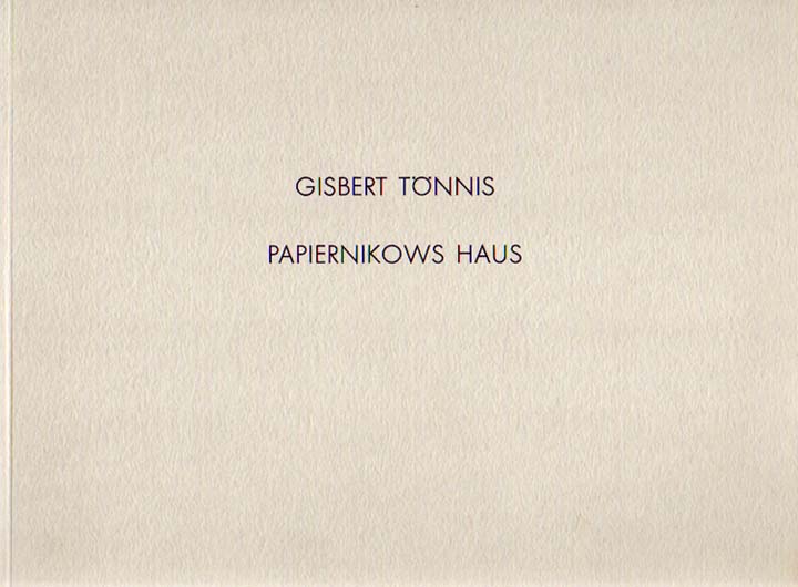 Tönnis, Gisbert: Papiernikows Haus – Raumprojekt. Kunstverein Freiburg e. V., 7. August – 6. September 1987; Städt. Museum Gelsenkirchen, April – Mai 1988; Leopold-Hoesch-Museum, Düren, September – Oktober 1988. Erste Auflage. Freiburg. Kunstverein Freiburg. 1987. 21 x 29 cm. 46 unpaginierte S. OKarton. Einband minimal angestaubt, sonst gutes Exemplar. Mit einem Text von Johannes Langner. Durchgehend mit großformatigen Abbildungen versehen, teilweise in Farbe.