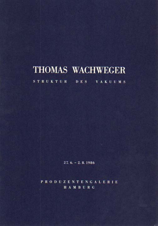 Wachweger, Thomas: Struktur des Vakuums. Produzentengalerie Hamburg, 27.6. – 2.8.1986. Auflage: 800 Exemplare. Hamburg. Produzentengalerie Hamburg. 1986. 30 x 21 cm. 16 unpaginierte S. OKarton. Gutes Exemplar. Mit einem Text von ursula Frohne und 15 farbigen Abbildungen.