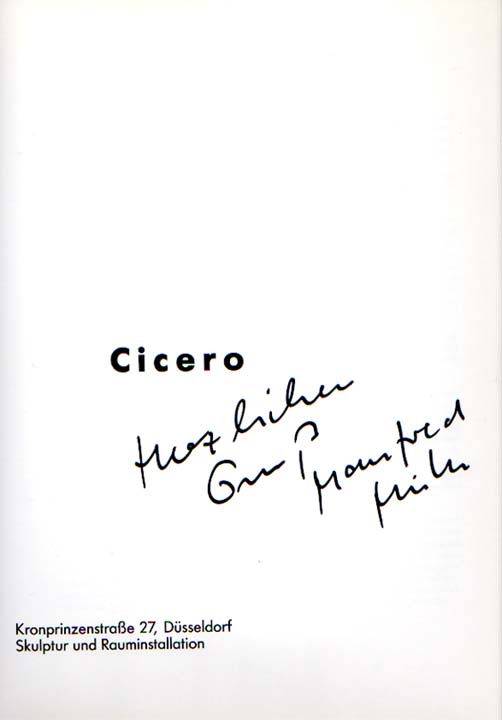 Müller, Manfred: Cicero. Skulptur und Rauminstallation. Kronprinzenstraße 27, Düsseldorf. Erste Auflage. Düsseldorf. Selbstverlag. [1989]. 29 x 24 cm. 59 S. OKarton. Gutes Exemplar. Titel mit einem handschriftlichem Gruß des beteiligten Künstlers Manfred Müller, signiert. Mit einem Vorwort von Manfred Schneckenburger. In einer ehemaligen Druckerei stellen 12 Künstler Skulpturen und Rauminstallationen aus: Nobuko Sugai, Ulf Rungenhagen, Ernst Hesse, Christa Feuerberg, Jochen Fischer, Erwin Wurm, Bertram Jesdinsky, Manfred Müller, Sobei Hashimoto, Keiji Uematsu, Peter Telljohan und Ralf-Peter Kaun.