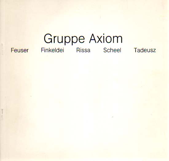 Gruppe Axiom. Feuser – Finkeldei – Rissa – Scheel – Tadeusz. Auflage: 2000 Exemplare. Köln. Galerie Axiom. 1977. 20 x 21 cm. 78 unpaginierte S. OKarton. Einbandkanten leicht gedunkelt, sonst gutes Exemplar. Manifest und Katalog der Malergruppe „Axiom“, das sind Astrid Feuser, Bernd Finkeldei, Rissa, Udo Scheel, Norbert Tadeusz. Mit meist farbigen Abbildungen.