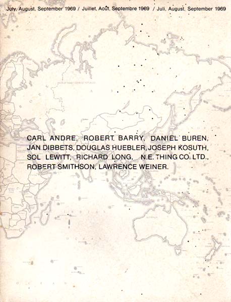 (LeWitt, Sol) – Seth Siegelaub: July, August, September 1969 / Juillet, Aout, Septembre 1969 / Juli, August, September 1969. Carl Andre – Robert Barry – Daniel Buren – Jan Dibbets – Douglas Huebler – Joseph Kosuth – Sol Lewitt – Richard Long – N. E. Thing Co. LTD – Robert Smithson- Lawrence Weiner. Catalog of the Exhibition / Catalogue de l´exposition / Ausstellungskatalog. First edition. New York. Seth Siegelaub. 1969. 27,7 x 21,2 cm. 28 S. OKarton. Umschlag gering nachgedunkelt , eine Stoßkante etwas berieben. Sonst sehr gutes Exemplar. Katalog zu einer von Seth Siegelaub initiierten internationalen Ausstellung, die an verschiedenen Orten der Welt gleichzeitig einen der vertreten Künstler vorstellte. Der Katalog dient wie schon bei vorherigen Publikationen Siegelaubs für denjenigen, der die weit verstreut ausgestellten Arbeiten und Aktionen nicht vor Ort erleben konnte, als eigentliche Arbeit oder aber, im anderen Fall, als Information, als Guide, die Bedeutung der Ausstellung zu erfahren. Der Katalog besteht aus zwei Teilen – Beschreibung und Dokumentation der Arbeiten sowie Definition der Ausstellungsorte. [Vgl. Seth Siegelaub. Beyond Conceptual Art, S. 170 – 171].