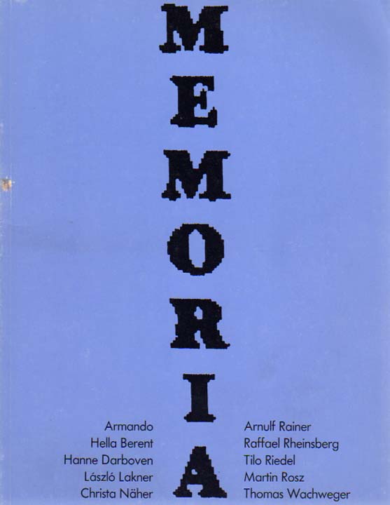 Memoria. Eine Ausstellung zeitgenössischer Kunst mit Armando, Hella Berent, Hanne Darboven, Laszlo Lakner, Christa Näher, Arnulf Rainer, Raffael Rheinsberg, Tilo Riedel, Martin Rosz, Thomas Wachweger. KUBUS an der Aegidienkirche, Hannover, 26. April bis 24. Mai 1987. Erste Auflage. Hannover. Wewerka Gallerie. 1987. 27 x 21 cm. 64 S. OKarton. Einband etwas berieben, kleiner Fleck auf dem vorderen Einband. Ordentliches Exemplar. Mit einem Vorwort von Prof. Dr. Karl-E. Bungenstab und einem Beitrag von Ernst A. Busche. Durchgehend mit Abbildungen versehen, teilweise in Farbe.