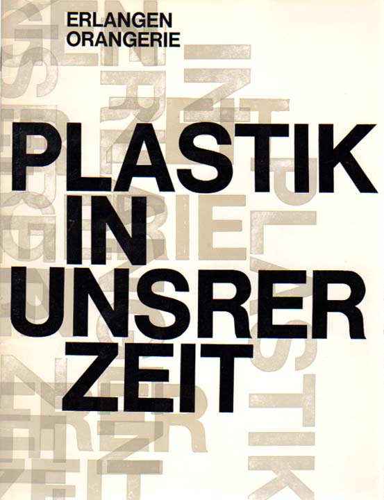 Plastik in unserer Zeit. Der Gemeinnützige Verein Erlangen e. V., Erlangen, Orangerie, 13. November bis 4. Dezember 1966. Aeschbacher – Armitage – Arp – Aschauer – Avramides – Baker – Bennet – Berrocal – Bertoia – Binder – Brühl – Bucher – Burghart – Cappelo – Chadwick – Cimiotti – Croissant – Delahaye – Dodeigne – Doyle – Droste – Fazzini – Fehrenbach – L. Fischer – Guerrini – Hajek – Hartung – [und viele weitere]. Erste Auflage. Erlangen. Der Gemeinnützige Verein Erlangen e. V. 1966. 27 x 21 cm. 20 unpaginierte S. OKarton. Einband gering gedunkelt, sonst gutes Exemplar. Enthält s/w Abbildungen von Arbeiten jedes beteiligten Künstlers.