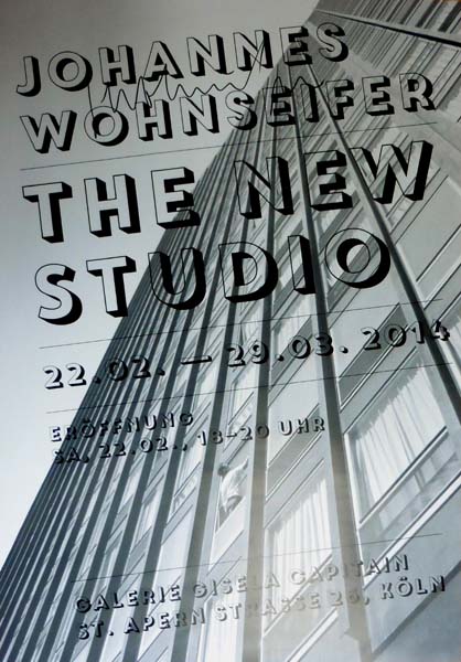 Wohnseifer, Johannes: The New Studio. [Plakat] Galerie Gisela Capitain, Köln, 22.02. – 29.03.2014. Köln. Galerie Gisela Capitain. 2014. 84 x 59 cm. 1 Blatt. Minimale Randläsuren, sonst sehr gutes Exemplar. Plakat anläßlich der Ausstellung „The New Studio“ von Johannes Wohnseifer bei Gisela Capitain in Köln. Mit einer großflächigen handschriftlichen Signatur von Johannes Wohnseifer.