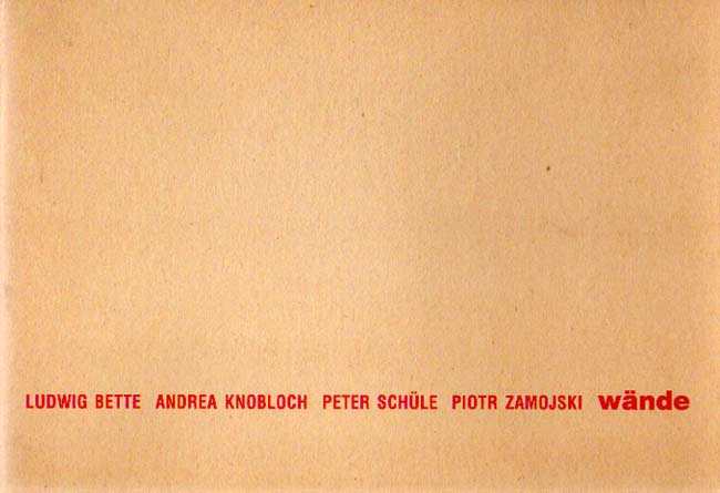 Wände. Ludwig Bette – Andrea Knobloch – Peter Schüle – Piotr Zamojski. [Museum Haus Esters, Krefeld, 19. September bis 7. November 1993]. Erste Auflage. Krefeld. Krefelder Kunstmuseen. 1993. 17 x 24 cm. 28 S. OKarton. Gutes bis sehr gutes Exemplar. Mit Texten von Eva Meyer-Hermann. Enthält 11 Abbildungen, davon 4 in Farbe. Beiliegend: Einladungskarte zur Eröffnung der Ausstellung.