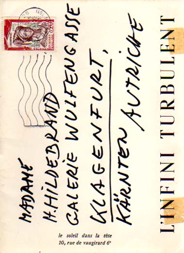L`infini turbulent. Berg – Bertholo – Bertini – L. Castro – de Clerq – Danil – Greenham – Marquet – Monjales – Rancillac – Staudacher – Tyszblat – Y. Voss. Le soleil dans la tete, Paris, Octobre 1961. Auflage: 1000 Exemplare. Paris. [Galerie] Le soleil dans la tete. 1961. 19 x 14 cm. 16 unpaginierte S. OKarton. Vorderer Einband mit 2 stärker gedunkelten Stellen, sonst gutes Exemplar. Postalisch gelaufener Galeriekatalog mit Briefmarke und handschriftlicher Adresse der Galerie Wulfengasse in Klagenfurt auf dem vorderen Einband. Enthält 7 s/w Abbildungen sowie 4 eingebundene s/w Serigraphien (Voss, Castro, Bertholo, Bertini).