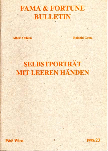 Oehlen, Albert – Rainald Götz: Selbstporträt mit leeren Händen. Vier Gespräche über Malerei, 1994 – 1998. Albert Oehlen / Rainald Goetz. Fama & Fortune Bulletin. Oktober 1998. Heft 23. Erste Auflage. Wien. Verlag Pakesch & Schlebrügge. 1998. 24 x 17 cm. OKarton. Sehr gutes Exemplar. Fama & Fortune Bulletin, Heft 23. Künstlerheft, herausgegeben von Peter Pakesch und Johannes Schlebrügge. Enthält 4 Gespräche über Malerei zwischen dem Maler Albert Oehlen und dem Schriftsteller Rainald Goetz. Mit 8 farbigen Werkabbildungen sowie 11 Fotoabbildungen in Schwarz-Weiß.