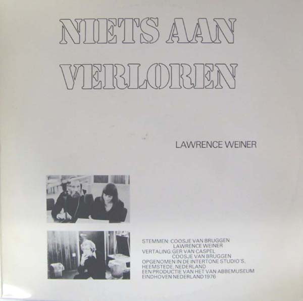 Weiner, Lawrence: Niets aan verloren / Nothing to lose. Voices: Coosje van Bruggen, Lawrence Weiner / Translation: Geer van Caspel, Coosje van Bruggen. Erste Pressung, RCS 352. Eindhoven Van Abbemuseum. 1976. 12“ / 33 rpm Vinyl. OKarton-Cover. Cover mit leichten Knitterspuren an den Kanten, sonst sehr gutes Exemplar. Cover very good + / near mint, Platte near mint. Recorded at Intertone Studios, Heemstede, the Netherlands. A Production of Van Abbemuseum, Eindhoven. Enthält Glockenspiel und gesprochene Texte Lawrence Weiners von ihm selber sowie von Coosje van Bruggen in Niederländisch und Englisch. Seite A: Nothing to Lose / S. B: Niets Aan Verloren. [Vgl. Broken Music S. 255; Schraenen, Vinyl, S. 96; As far as the eys can see. MOCA 2007, S. 380; As far as the eys can see. MOCA 2007, S. 380; Michael Lailach. Printed Matter – Die Sammlung Marzona in der Kunstbibliothek. Berlin, 2005, S. 167].