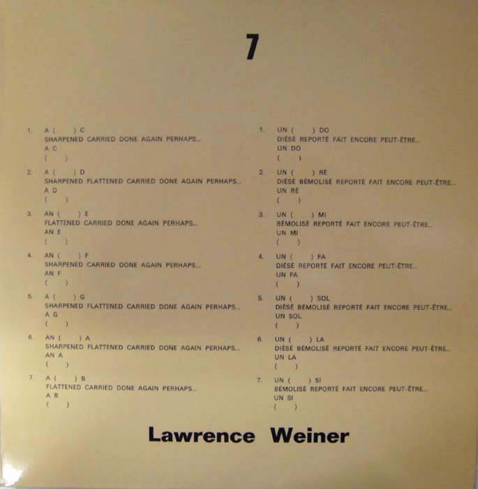 Weiner, Lawrence: 7. Paris. Galerie Yvon Lambert. 1972. 12“ / 33 rpm Vinyl. OKarton-Cover. Nahezu tadelloses Exemplar, Platte und Cover near mint. Erste und einzige Pressung der ersten Schallplattenveröffentlichung. Seite 1 enthält gesprochene Texte von Lawrence Weiner (englisch) unterlegt mit Flöte von Pierre-Yves Artaud, Seite 2 gesprochene Texte (französisch)von Beatrice Conrad-Eybesfeld, Flöte wie Seite 1. [Vgl. Broken Music S. 254; Schraenen, Vinyl, S. 71, As far as the eys can see. MOCA 2007, S. 380; Nicht bei Michael Lailach. Printed Matter – Die Sammlung Marzona in der Kunstbibliothek. Berlin, 2005].