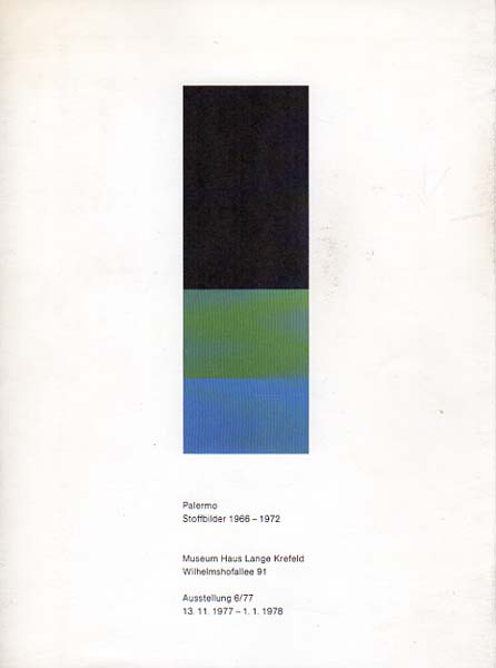Palermo [Blinky – d. i. Peter Heisterkamp]: Stoffbilder 1966 – 1972. Museum Haus Lange, Krefeld. Ausstellung 6/77. 13.11.1977 – 1.1.1979. 1. Auflage. Krefeld. Museum Haus Lange. 1977. 23 x 17 cm. 60 unpaginierte S. OKarton mit OUmschlag. Umschlag gering angestaubt und am Rücken minimal nachgedunkelt. Gutes bis sehr gutes Exemplar. Enthält: Gerhard Storck – Die Stoffbilder von Palermo. Ausstellungskonzeption, Werkabfolge + Erläuterungen. Mit dem vollständigen Werkverzeichnis der Stoffbilder.