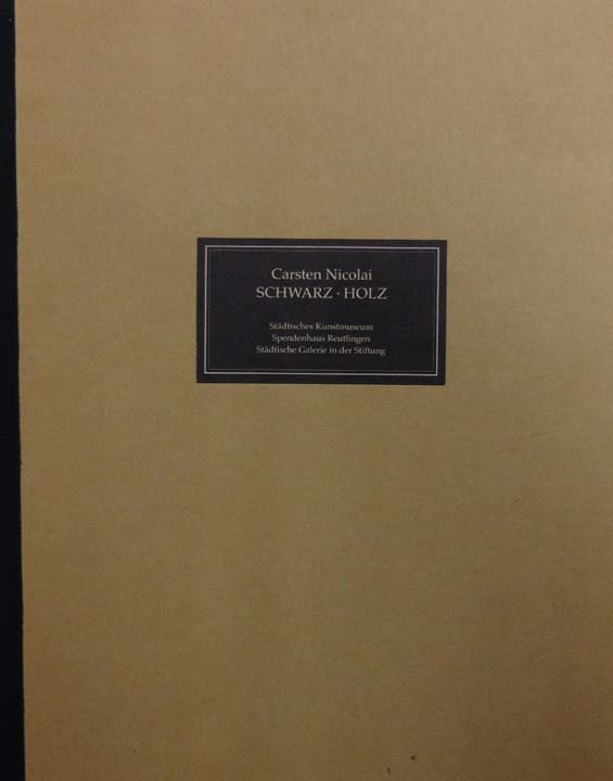 Nicolai, Carsten: Schwarz – Holz. Städtisches Kunstmuseum Spendhaus Reutlingen, Städtische Galerie in der Stiftung, 8. Mai – 31. Juli 1994. Auflage: 1000 Exemplare. Reutlingen. Städtisches Kunstmuseum Spendhaus Reutlingen. 1994. 29 x 23 cm. OPappband mit Leinenstreifen-Bindung und montiertem Titel. Vorderer Einband mit 2 winzigen Fleckchen an der unteren Kante. Gutes Exemplar. Mit einem Text von Peter Guth und mit zweifarbigen Abbildungen von den Holzdrucken des Carsten Nicolai.