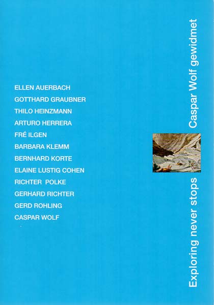 Exploring never stops – Caspar Wolf gewidmet. Ellen Auerbach – Gotthard Graubner – Thilo Heinzmann – Arturo Herrera – Fré Ilgen – Barbara Klemm – Bernhard Körte – Elaine Lustig Cohen – Richter / Polke – Gerhard Richter – Gerd Rohling – Caspar Wolf. Berlin. Kunsthadel Wolfgang Werner. 2012. 32 x 22 cm. 16 S. OKarton. Tadelloses Exemplar. Galerieausstellung, kuratiert von Sibylle Kaldewey, mit deren Textbeitrag „Exploring never stops – Caspar Wolf gewidmet. Wasser Eis Natur. Ausstellung vom 11.2.-17.3.2012. Durchgehend mit meist farbigen Abbildungen versehen.