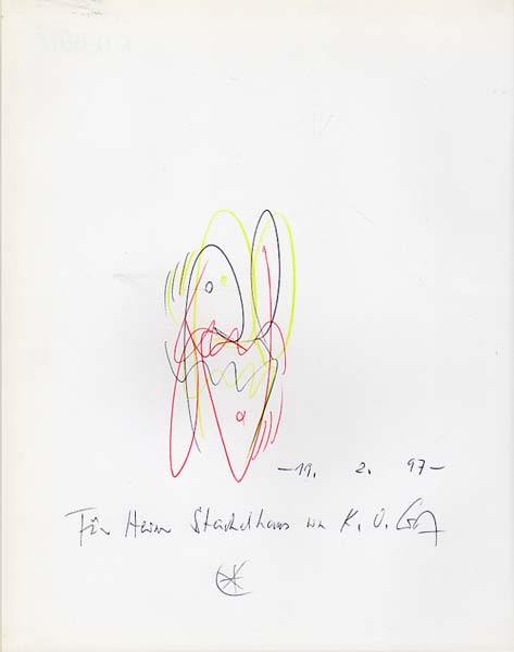 Götz, K. O. Die Monotypien. Herausgegeben von Wolfgang Zemter. 1. Auflage. Bönen. Druckverlag Kettler. 1996. 30 x 24 cm. 136 S. OPappband mit OUmschlag. Rücken am Kapital gering bestoßen, sonst sehr gutes Exemplar. Durchgehend mit Abbildungen versehen. Verso Vortitel mit einer mehrfarbigen figurativen Signaturzeichnung von K.O.Götz über zwei Drittel der Seite versehen, handschriftlich dem Kunstkritiker Heiner Stachelhaus gewidmet, signiert und datiert Juli 19.2.1997. .