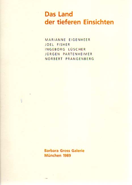 Das Land der tieferen Einsichten. Eine Ausstellung in zwei Teilen 1 Ingeborg Lüscher – Jürgen Partenheimer – Norbert Prangenberg 2 Marianne Eigenheer – Joel Fisher. Erste Auflage. München. Barbara Gross Galerie. 1989. 24 x 17 cm. 23 S. OKarton. Sehr kleiner Strich auf dem vorderen Einband, sonst sehr gutes Exemplar. Mit Texten von Barbara Gross, Thomas Deecke und Marianne Eigenheer. Enthält 5 montierte farbige Abbildungen sowie 10 s/w Abbildungen.