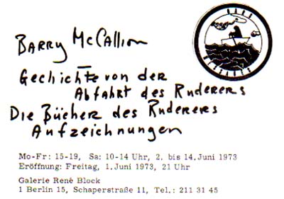McCallion, Barry: Geschichte von der Abfahrt des Ruderers. Die Bücher des Ruderers. Aufzeichnungen. [Einladung] Galerie Rene Block, 2. bis 14. Juni 1973. Berlin. Galerie Rene Block. 1973. 10,5 x 14,8 cm. 1 Blatt. OKarton-Karte. Sehr gutes Exemplar. Einfache einseitig bedruckte Karte mit handschriftlich wiedergegebenem Text. [Vgl. Rene Block. Ich kenne kein Weekend. n.b.k., S.468 ].