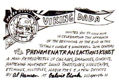 Hansen, Al: Viking Dada. Phenomenatransactionskunst. [Einladung] Galerie Rene Block, 7. Juli bis 8. August 1973. Berlin. Galerie Rene Block. 1973. 10,5 x 14,8 cm. 1 Blatt. OKarton-Karte. Sehr gutes Exemplar. Vom Künstler gestaltete, geschriebene und gezeichnete Karte. [Vgl. Rene Block. Ich kenne kein Weekend. n.b.k., S.468 ].