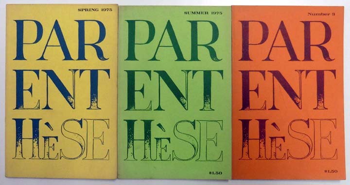 Parenthese. A Magazine of Words and Pictures. Spring 1975 / Summer 1975 / Number 3. 3 Bände. New York. Parenthese / Kulchur Foundation. 1975. 22 x 14 cm. 55; 69 – 128; 141 – 196 S. OKarton. Einbände angestaubt, sonst gute Exemplare. Text in Englisch / Text English. Mit Beiträgen von John Ashberry, Rupert Barnaby, Guy Davenport, Barbara Guest, Kenneth Koch, [und weitere]. Enthält u.a. s/w Abbildungen mit Arbeiten von Cy Twombly, Jean Tinguely, Joseph Cornell, Robert Rauschenberg, Alexander Calder, [und weitere].