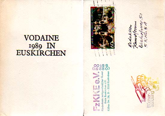 Vodaine, Jean [eigentl. Frederic Vladimir Kaucic]: Vodaine 1989 in Euskirchen. Förderkreis zeitgenössischer Kunst Kreis Euskirchen e.V., 22. September bis 20. Oktober [1989]. Erste Auflage. Euskirchen. Förderkreis zeitgenössischer Kunst Kreis Euskirchen e.V. 1989. 14,5 x 10 cm. 32 unpaginierte S. (Büttenpapier). OKarton. Rücken etwas nachgedunkelt, hinterer Einband mit Adressierung etc., sonst gutes Exemplar. Postalisch gelaufenes Künstlerbüchlein von Jean Vodaine. Im Handsatz gedruckt auf einer hundertjährigen Phoenix Nummer 3. Ohne Abbildungen.