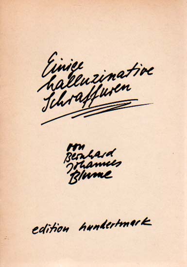 Blume, Bernhard Johannes: Einige halluzinative Schraffuren. Auflage: 300 Exemplare. Berlin. Edition Hundertmark. 1978. 21 x 15 cm. 16 unpaginierte S. OKarton. Papier nachgedunkelt, sonst gutes Exemplar. 4. Heft der Edition Hundertmark. Künstlerbuch von Bernhard Johannes Blume. Mit 14 ganzseitigen s/w Abbildungen.