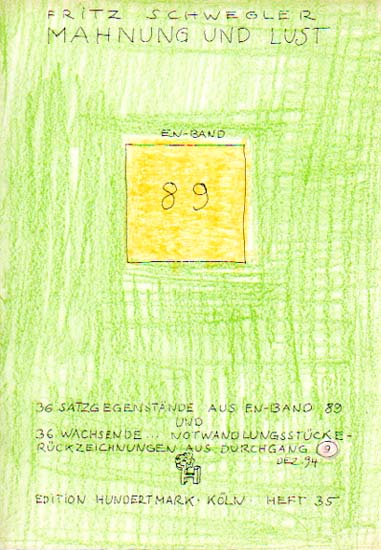Schwegler, Fritz: Mahnung und Lust. En-Band 89. 36 Satzgegenstände aus En-Band 89. 36 wachsende… Notwandlungsstücke-Rückzeichnungen aus Durchgang 9, Dez. 94. Auflage: 500 Exemplare. Köln. Edition Hundertmark. 1994. 21 x 15 cm. 16 unpaginierte S. OKarton. Sehr gutes Exemplar. 35. Heft der Edition Hundertmark. Künstlerbuch von Fritz Schwegler. Durchgehend mit s/w Abbildungen versehen.