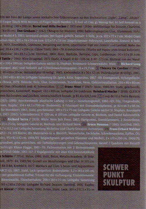 Schwerpunkt Skulptur. Wie Vorstellungen Form angenommen haben. Ausstellungsbilder seit 1969. Erste Auflage. Krefeld. Krefelder Kunstmuseen. 1992. 30 x 21 cm. 62 S., 1 Blatt. OKarton mit OKlappenumschlag. Sehr gutes Exemplar. Mit einem Vorwort von Gerhard Storck. Durchgehend mit s/w Abbildungen versehen. Erschien anläßlich der Ausstellung „Schwerpunkt Skulptur“ im Kaiser Wilhelm Museum, 21.6. – 11.10.1992. Die Künstler: Carl Andre, Joseph Beuys, Jannis Kounellis, Sol LeWitt, Richard Long, Mario Merz, Bruce Nauman, Claes Oldenburg, David Rabinowitch, Ulrich Rückriem, Reiner Ruthenbeck, Richard Serra, Franz Erhard Walther und Lawrence Weiner.