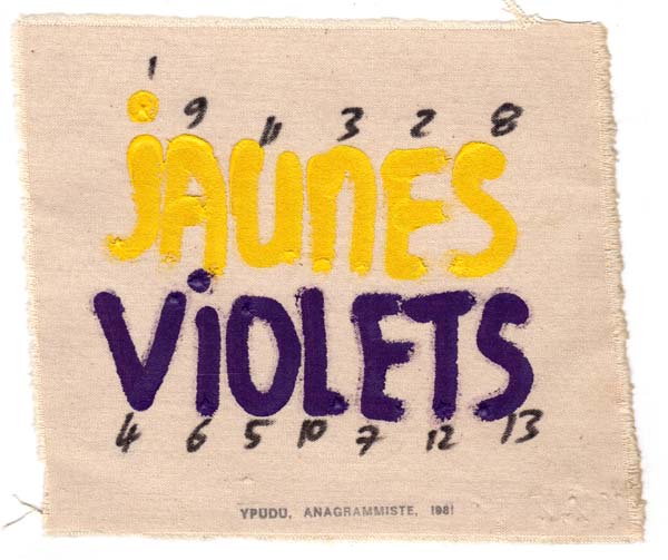 Dupuy, Jean: Jaunes Voilets. YPUDU Anagrammiste 1981. Acryl, gelbe und violette Schrift, Tinte und Stempel auf Leinwand. Stempelsigniert „YPUDU Anagrammiste 1981. 21,0 x 18,5 cm.