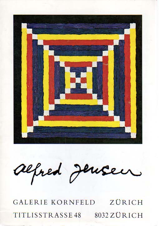 Jensen, Alfred: Ölbilder. Galerie Kornfeld, Zürich, 8. September – 21. Oktober 1972. Erste Auflage. Zürich. Galerie Kornfeld. 1972. 30 x 21 cm. Faltkatalog (3 Blatt). OKarton. Kleine Bestoßung an der unteren Kante, Papier gering nachgedunkelt, sonst gutes Exemplar. Mit Verzeichnis der ausgestellten Arbeiten, Biographie und Einzelausstellungen des Künstlers sowie mit 3 abgebildeten Arbeiten, davon 1 in Farbe.