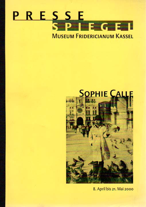 Calle, Sophie: Pressespiegel zu Die wahren Geschichten der Sophie Calle (8. April bis 21. Mai 2000). Stand: 2.6.2000. Erste Auflage. Kassel. Museum Fridericianum. 2000. 30 x 21 cm. 64 S. OKarton mit Leinenstreifen. Vorderer Einband und Vorsatz mit geringen Spuren von Büroklammer. Gutes bis sehr gutes Exemplar. Durchgehend mit xerographierten Pressemitteilungen (Printmedien, Online-Dienste, TV- und Radio-Sender) versehen.